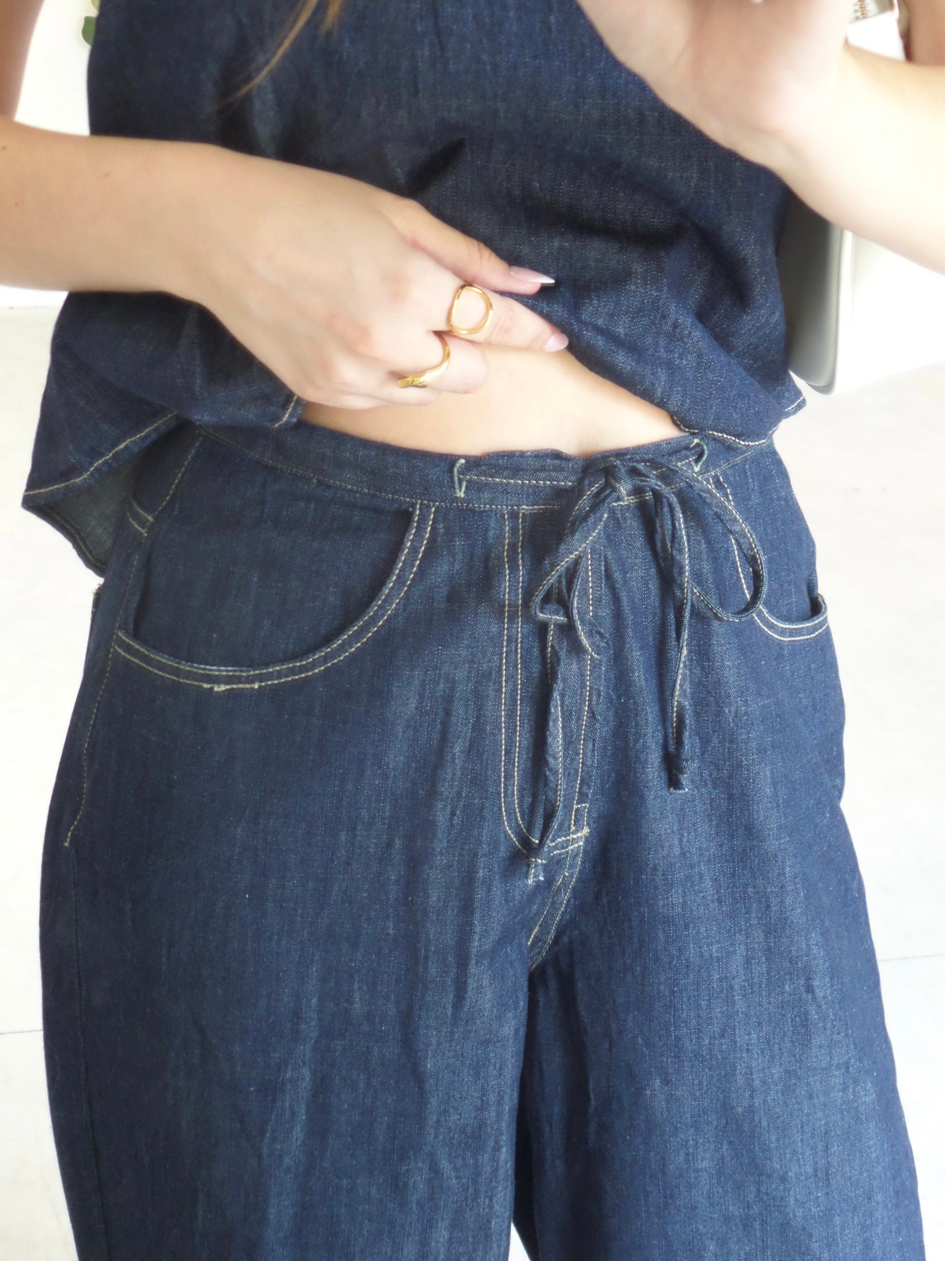 - Dark denim with brown stitching
